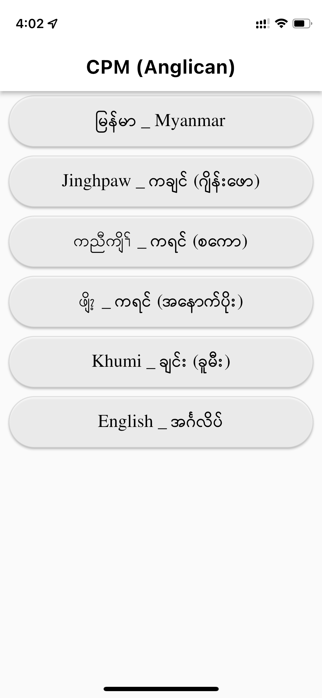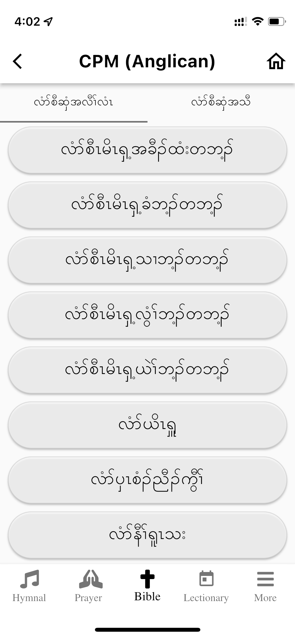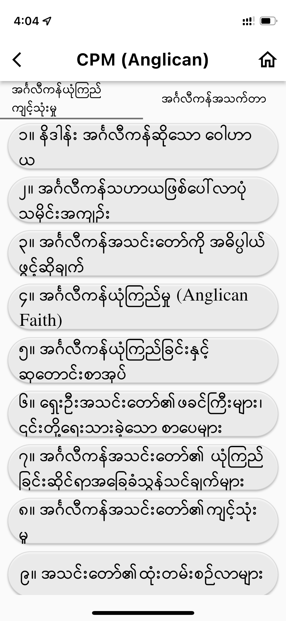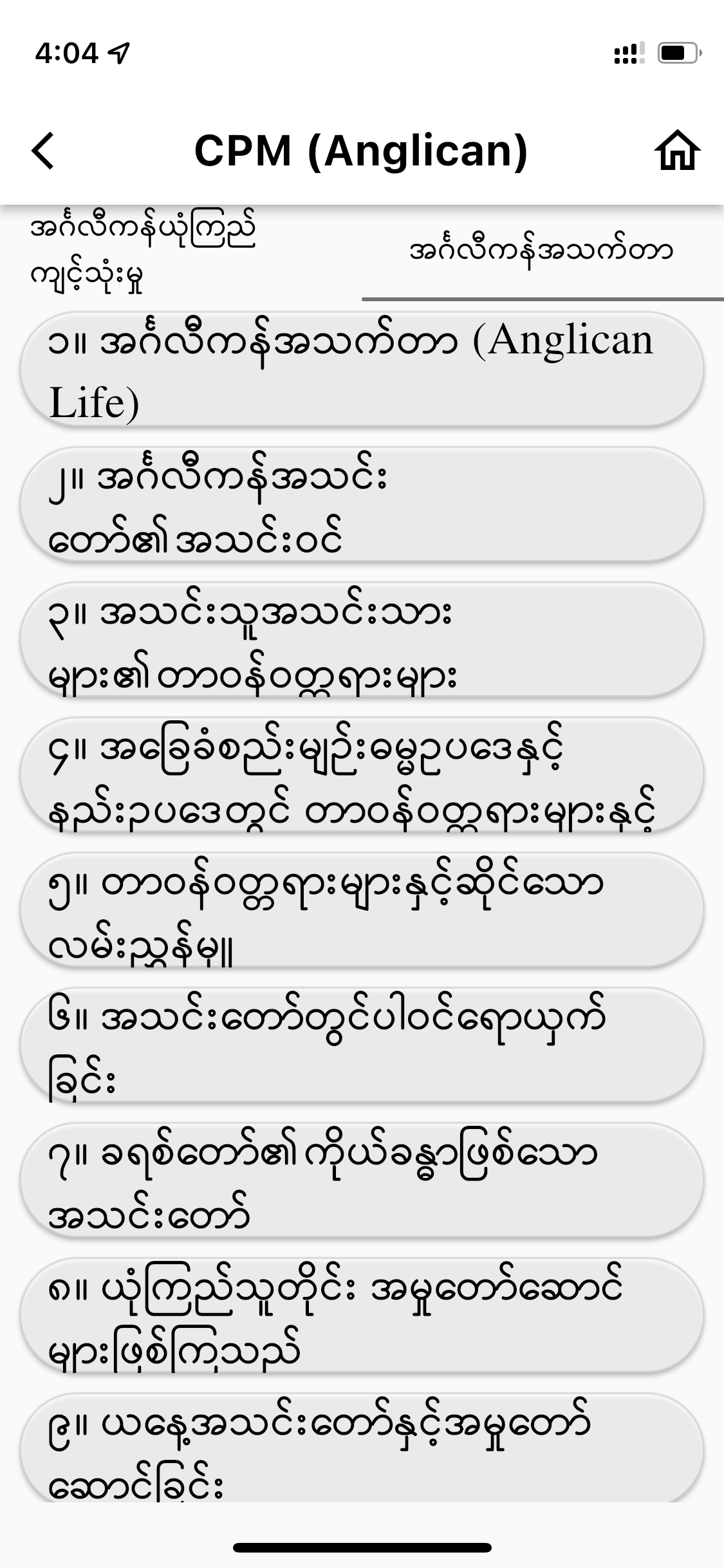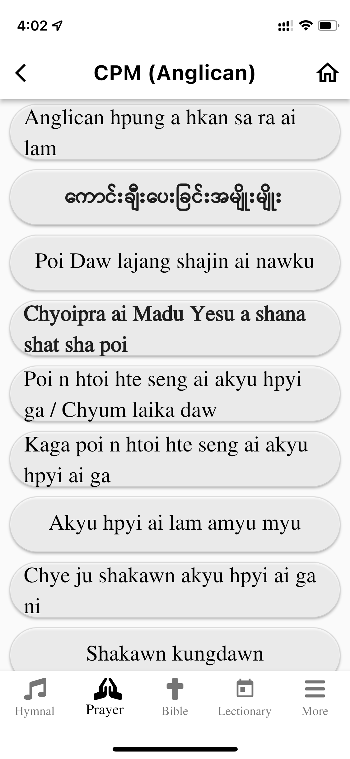 All the entire book of common prayer in Myanmar, Karen, Kachin, Khumi_Chin and English Languages which has been developed to be used at convenience,